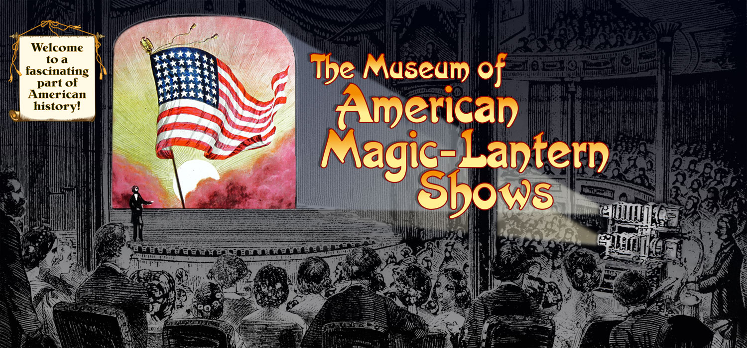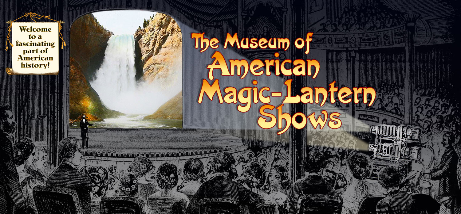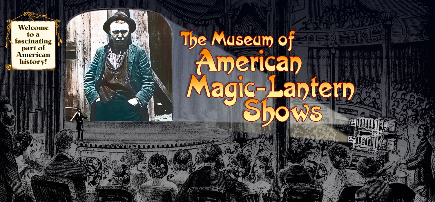 This virtual museum brings to life the way magic-lantern shows influenced every facet of American culture from the 1850s to the 1930s. The magic lantern, or “stereopticon” was the first projector, and a forerunner of the movies and cinema. Millions of people a year saw lantern shows and illustrated lectures in theaters, Lyceum halls, Chautauqua tents, fraternal societies, churches, and their own homes.In this museum you’ll see lantern broadsides, ads, and slides like those being projected in the scene above—all from the shows that help mold a nation.