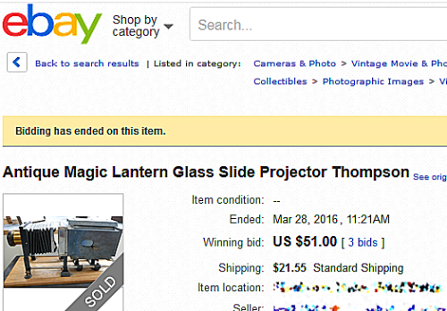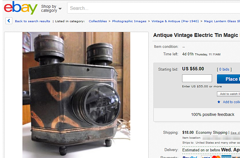 Study the market for several weeks. Then set a budget for what you will pay, and keep bidding that amount, week after week, until you win. Don’t panic if you don’t win the first time. There are in fact thousands of lanterns and slides out there. Be patient.