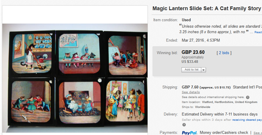 3. After winning your first lot, focus on slide subjects of particular interest to you, or try getting a different type of toy lantern with your remaining money. To buy more slides, you need to focus—so to speak. There are sometimes a thousand new slides for sale on eBay in a single week, so you’ll need to narrow your choices.