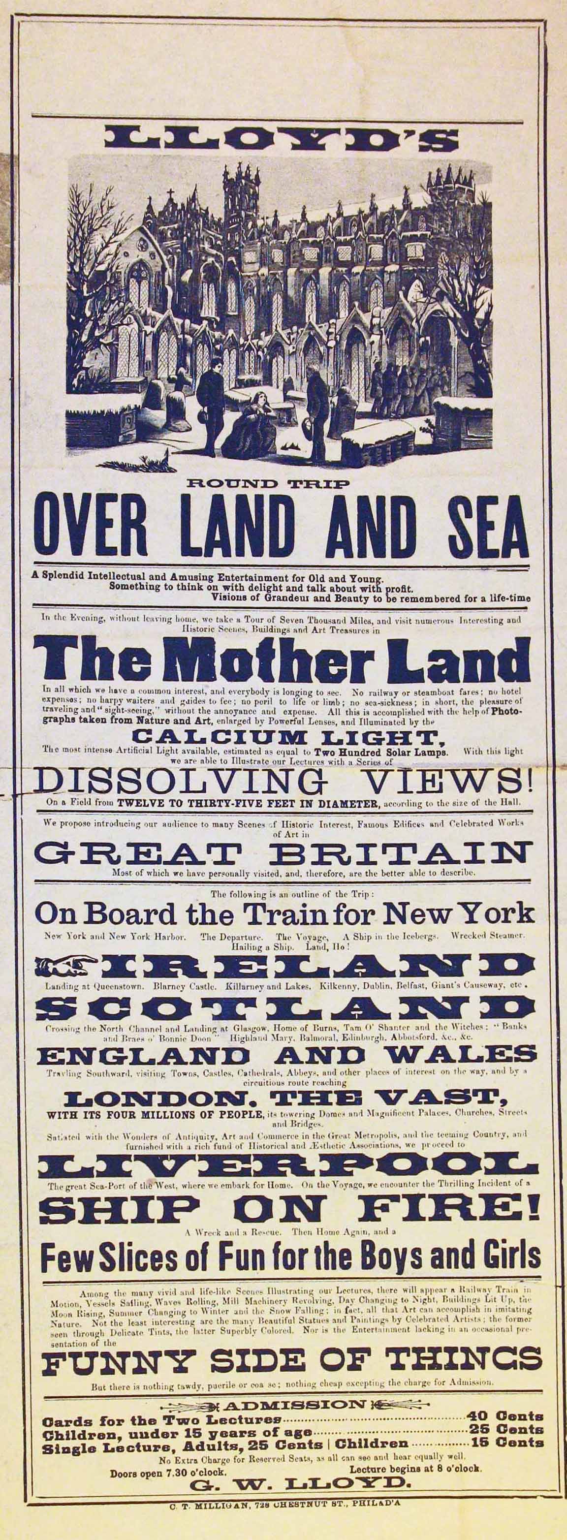 Lloyd’s broadside has one of the best lines in all of Magic-Lantern promotion: “Nor is the Entertainment lacking in an occasional presentation of the FUNNY SIDE OF THINGS. But there is nothing tawdry, puerile, or coarse; nothing cheap excepting the price for Admission.”