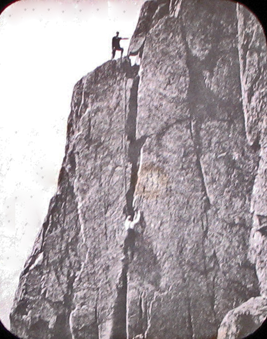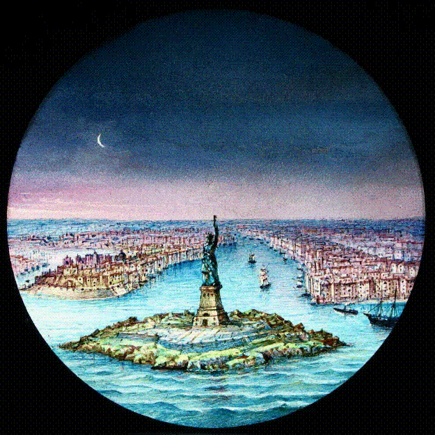 The techniques for developing photographic lantern slides were perfected in the 1850s, and by the 1860s photographs were well on their way to becoming the dominant form of screen presentation. Lloyd’s broadside offered a tour of America and England, probably using the black and white photographic slides like the one shown. He also included Dissolving Views. Here a triple dissolve of the Statue of Liberty changes from evening to night. (Click image. Loads slowly.)