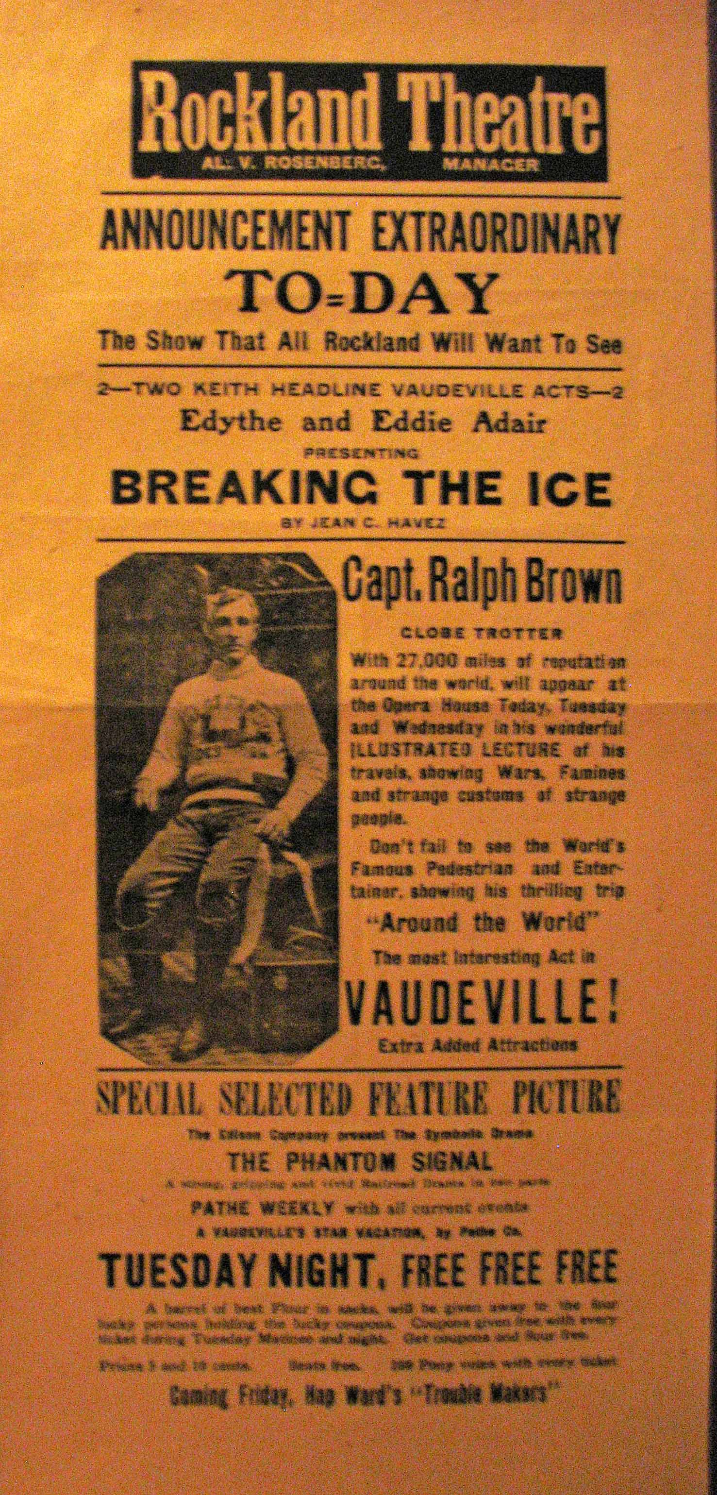 The Rockland Theatre Vaudeville, 24 years later than Pastor’s, features Illustrated Lecturer Capt. Ralph Brown, with his “World Famous Pedestrian” sweater, and his pistol. The box beside him is probably his camera.