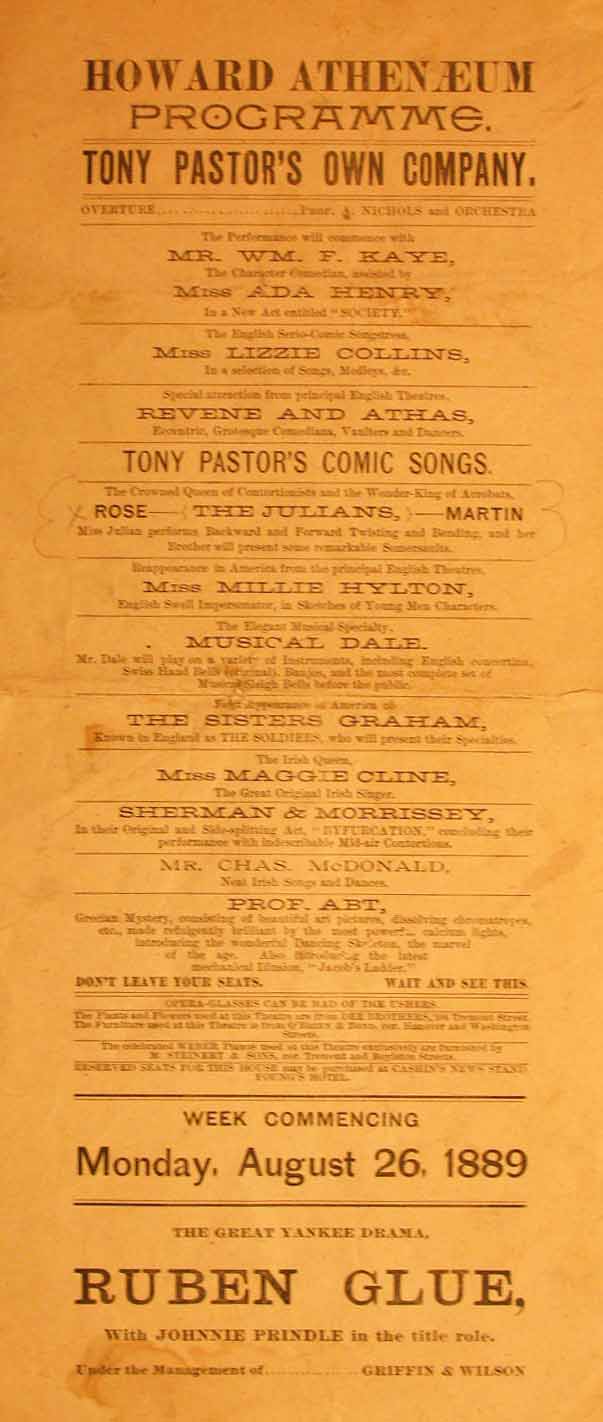 Lantern shows were part of the very first vaudeville programming created by Tony Pastor, the “Father of Vaudeville,” who gave some lantern shows himself. An early 1889 Tony Pastor broadside (left) touts a variety of lantern effects by “Prof. Abt” that were popular at the time—art pictures, dissolving views, chromatropes, and the dancing skeleton. Vaudeville was usually variety “family entertainment,” and women were welcome. Lantern shows fit easily into that format.