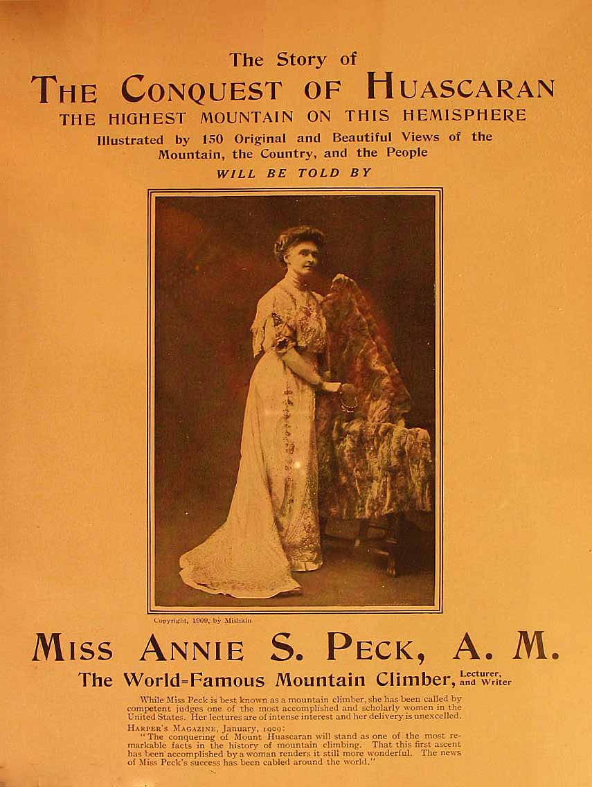 Five-to-ten percent of professional lantern performers were women lecturers. In addition to Katherine Bowden, discussed earlier, one of the most outstanding was Annie Peck, seen in a 1908 advertisement for her lecture at the Academy of Music in Brooklyn.