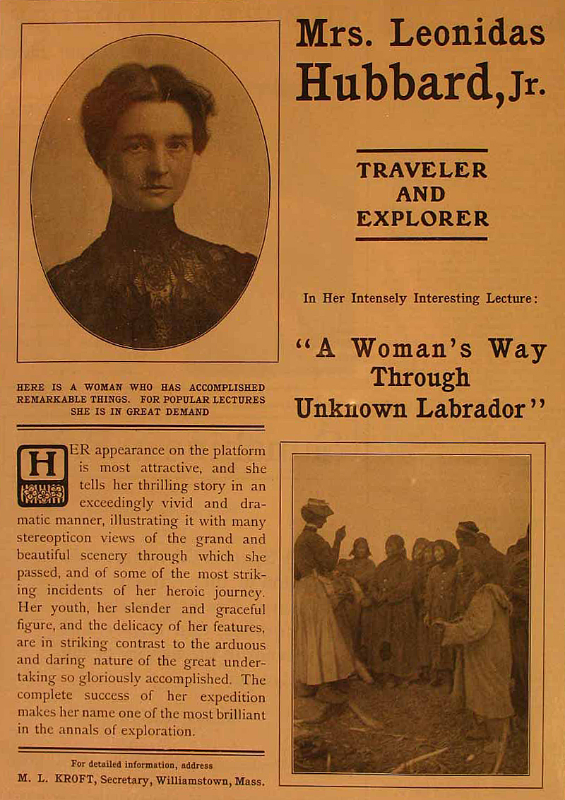 A 1906 ad in Talent, tells us that Mrs. Leonidas Hubbard presents, “her thrilling story in an exceedingly vivid and dramatic manner, illustrating it with many stereopticon views of the grand Labrador scenery. . . Her youth, her slender and graceful figure, and the delicacy of her features are in striking contrast to the arduous and daring nature of [her] great undertaking.”