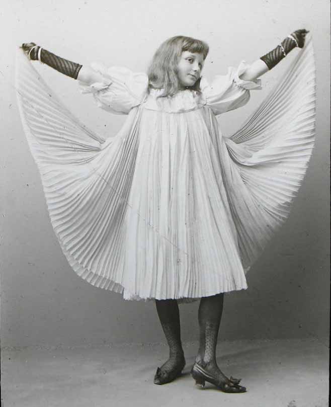 Her performances themselves were widely copied, using slides purchased from commercially available lantern catalogs. A slide shows a young girl trying out her new “skirt dance” costume, perhaps preparing to perform before the magic lantern.