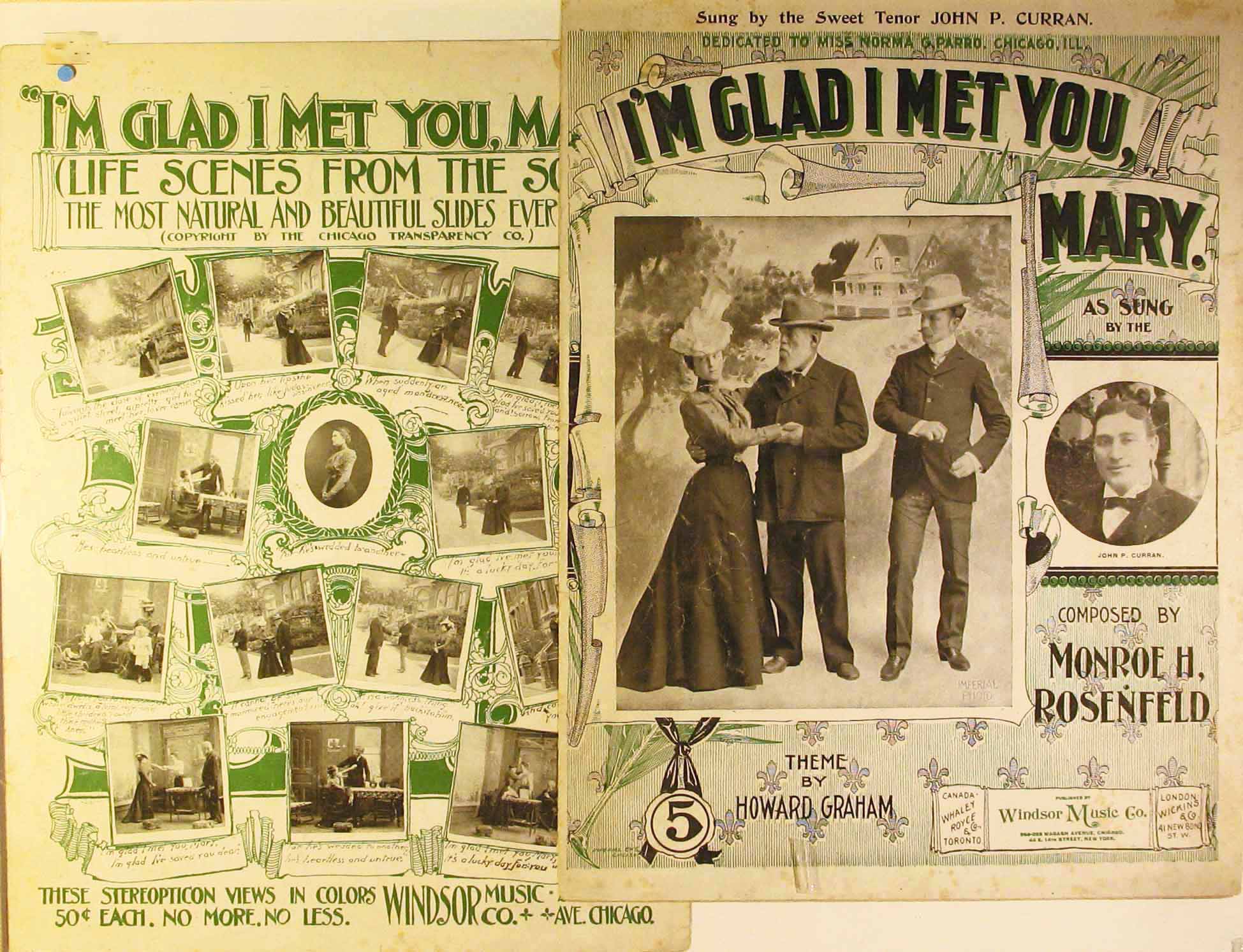 This sheet music for “I’m Glad I Met You, Mary” shows the slides that accompanied the song. Hear (and see!) an illustrated song here.