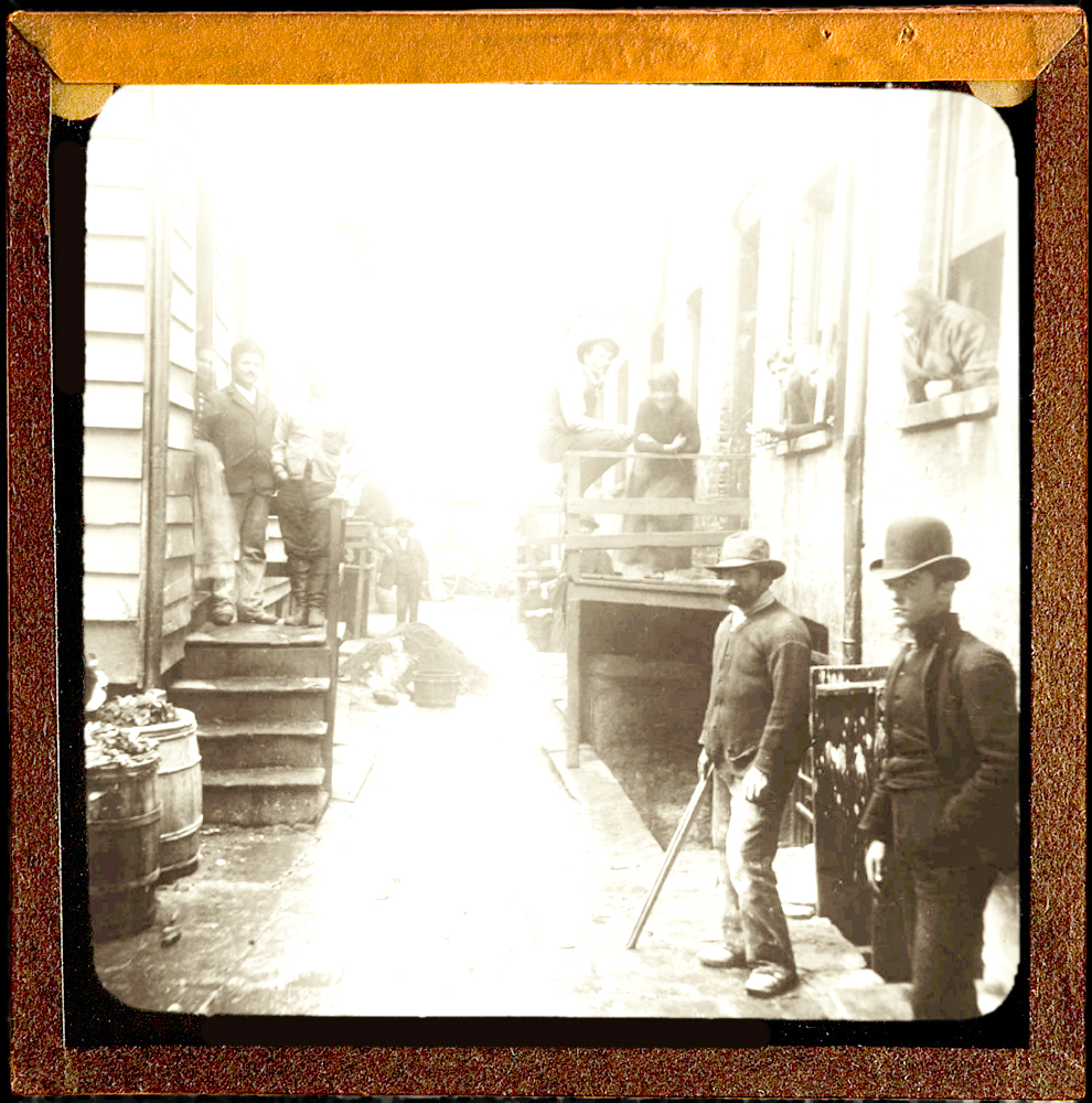 Illustrated Lectures were much more common than entertainment shows in the 1890s, their popularity driven by the Victorian passion for cultural improvement (Slum picture). They constitute the majority of the shows promoted in the Museum’s exhibits, and cover every conceivable subject. Click here for a eight-minute condensation of an actual illustrated lecture— Jacob Riis’s impassioned plea for reform in New York’s slums.